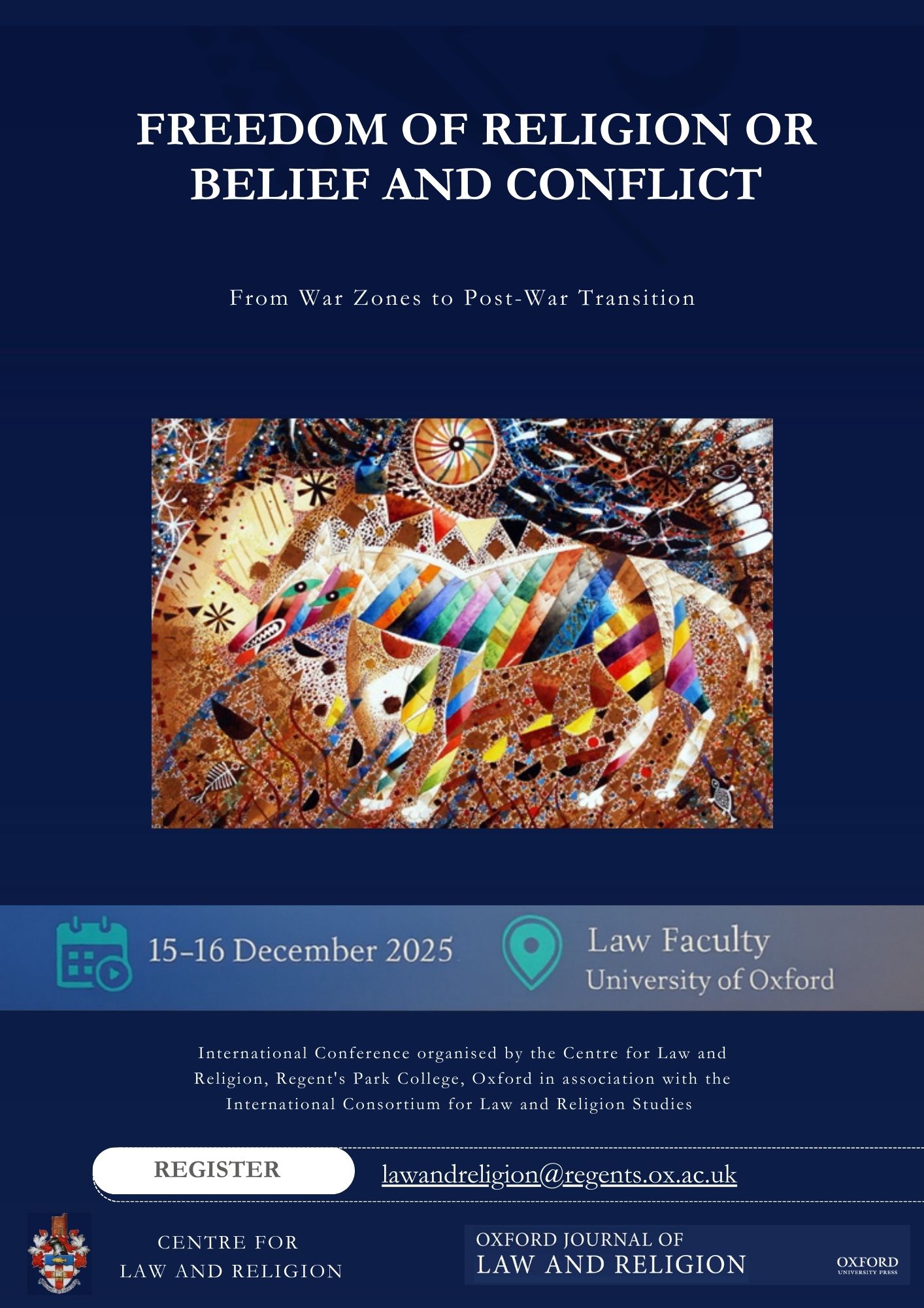 The Oxford Centre for Law and Religion at Regent’s Park College, Oxford is hosting a two-day International Conference on Freedom of Religion or Belief and Conflict at the Law Faculty on 15 and 16 December 2025. The conference brings together academics and policy makers who will explore freedom of religion or belief and conflict from comparative an interdisciplinary perspectives.