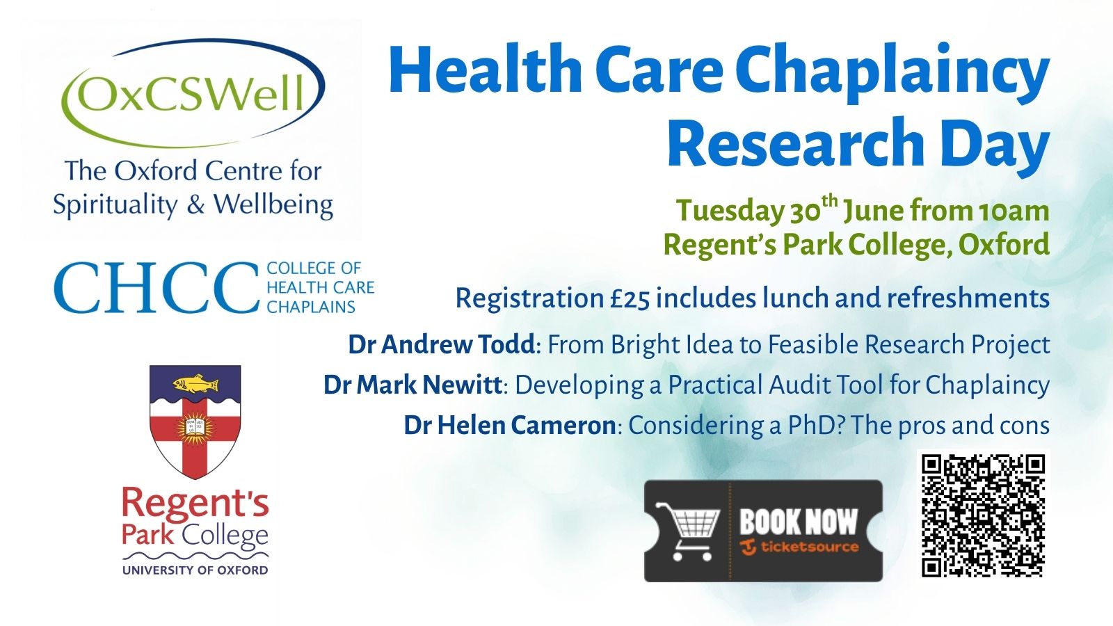 OxCSWell (Oxford Centre for Spirituality and Wellbeing) in collaboration with the CHCC (College of Health Care Chaplains) and Regent’s Park College, Oxford are organising a day conference in Oxford on Tuesday, 30th June on the topic of Chaplaincy Research.